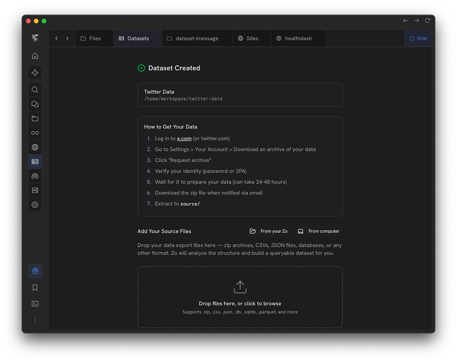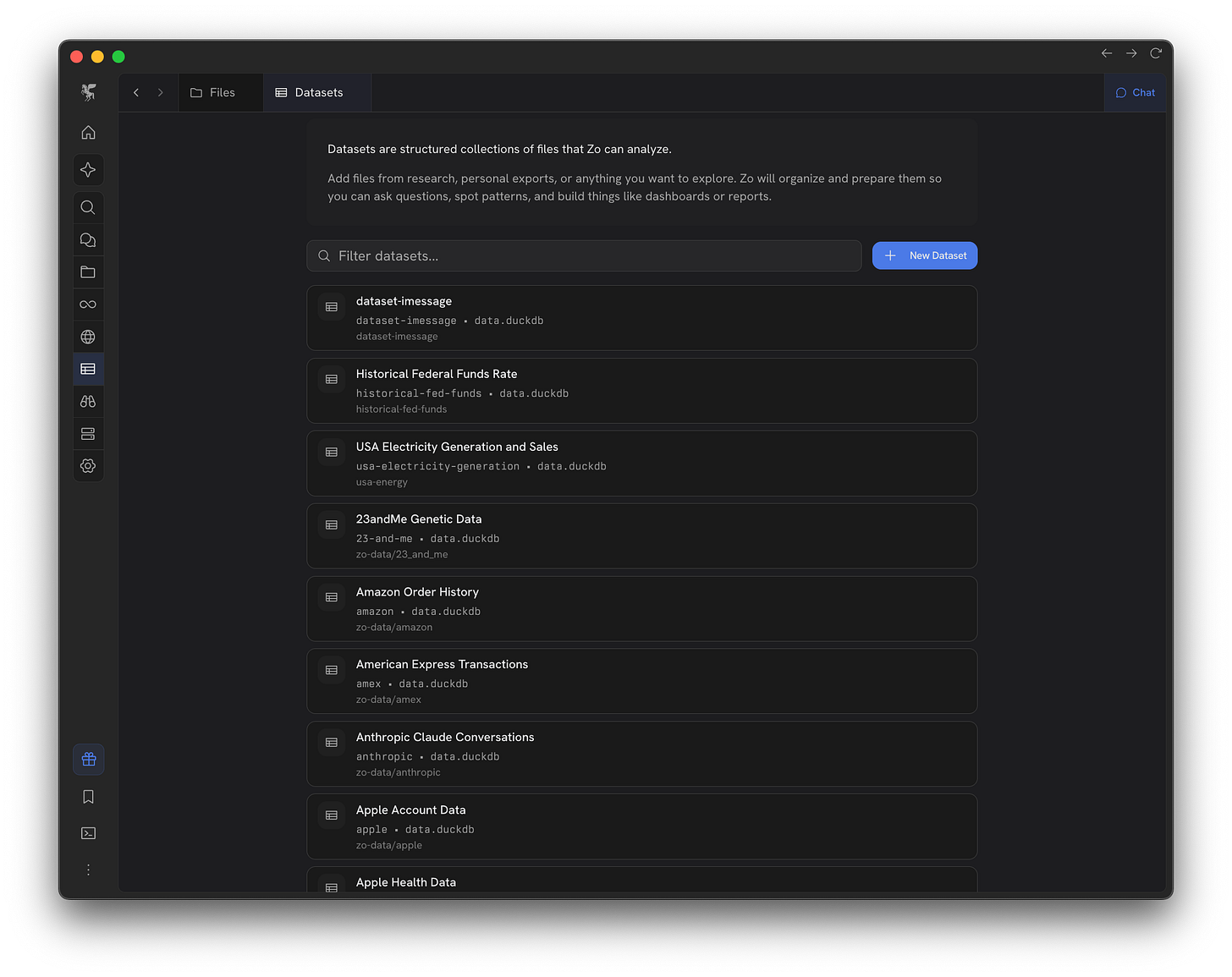 Zo Datasets is basically a mini-ETL pipeline that can take in datasets in any form. You can import data from platforms like Instagram, Spotify, Amazon, etc. or bring your own (or have Zo gather it from the web for you) datasets like demographic data, energy data, etc. Zo will automatically inspect it, decide how to organize and load it into a nice clean database, document that database, then let you ask questions or build artifacts from it. It's designed to be a general framework that accepts any data, and it will apply a basic set of operations that resemble what a professional Data Scientist would do to prepare messy information for analysis.
