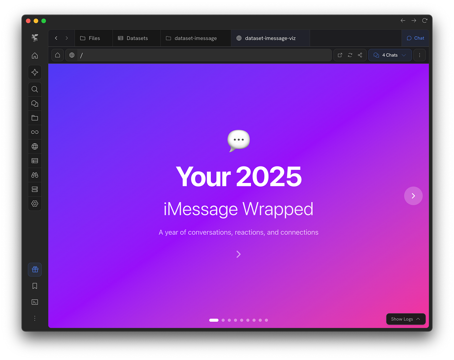 We have built in templates for some common data exports, but you can always start fresh, drag files into a dataset's "source" folder, and tell Zo to prepare it for analysis. As a fun bonus we've even included an automatic pipeline to "2025 Wrapped" anything, whether it's your Netflix data, Amazon history, or even Doordash (lol) data.
